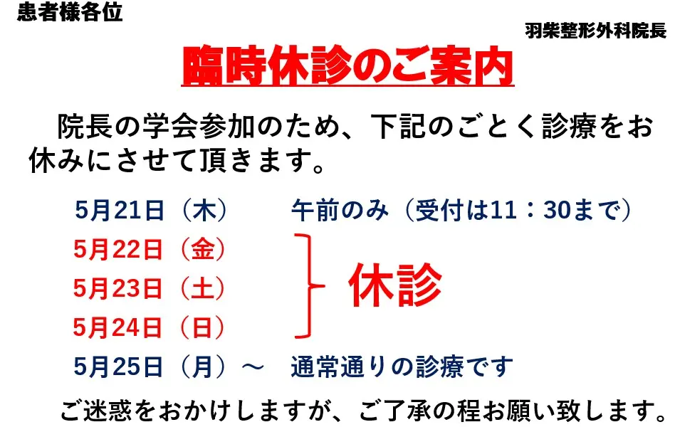 院長の学会参加のため、令和8年5月下記のごとく診療をお休みにさせて頂きます。 ◎令和8年5月22日(金)、5月23日(土)を休診といたします。 5月21日(木)は通常通り午前のみの診療で、受付時間は午前11時半までです。 なお、5月25日(月)からは通常通りの診療です。